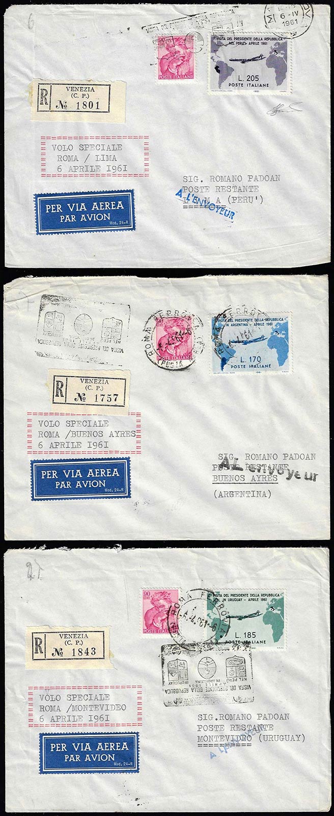 1961 - 205 lire Gronchi rosa (921), ricoperto, con complementare, su aerogramma raccomandato da Venezia, annullo speciale del volo di Roma 6/4/1961, a Lima, bolli di arrivo al verso. Allegati due aerogrammi con gli altri valori della serie.