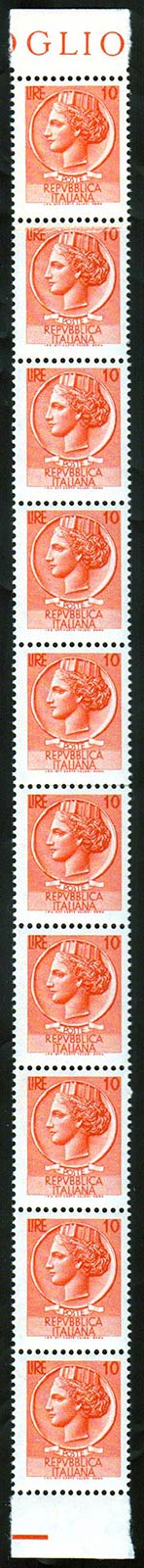 1968 - 10 lire Siracusana, striscia verticale di 10, due esemplari stampati su carta ricongiunta, gomma integra, perfetta. Ferrario.