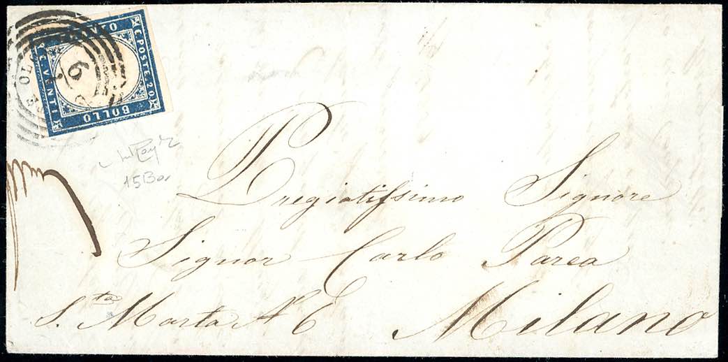 CORTE OLONA, C4 punti 12 - 20 cent. (Sardegna 15Ba), margine a filo a destra, su lettera del 1/9/1859 a Milano. Cert. Raybaudi.
