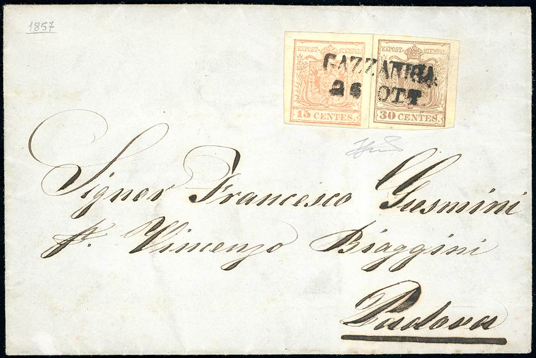 GAZZANIGA, SD punti 7 - 15 cent., 30 cent. (20,21), perfetti, su lettera del 26/10/1857 per Padova.