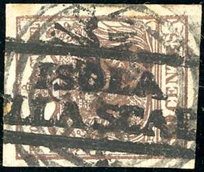 ISOLA DELLA SCALA, R s.d. punti R3 - 30 cent., nitido decalco al verso (7i), perfetto, usato. Molto raro. Cert. R.Diena.