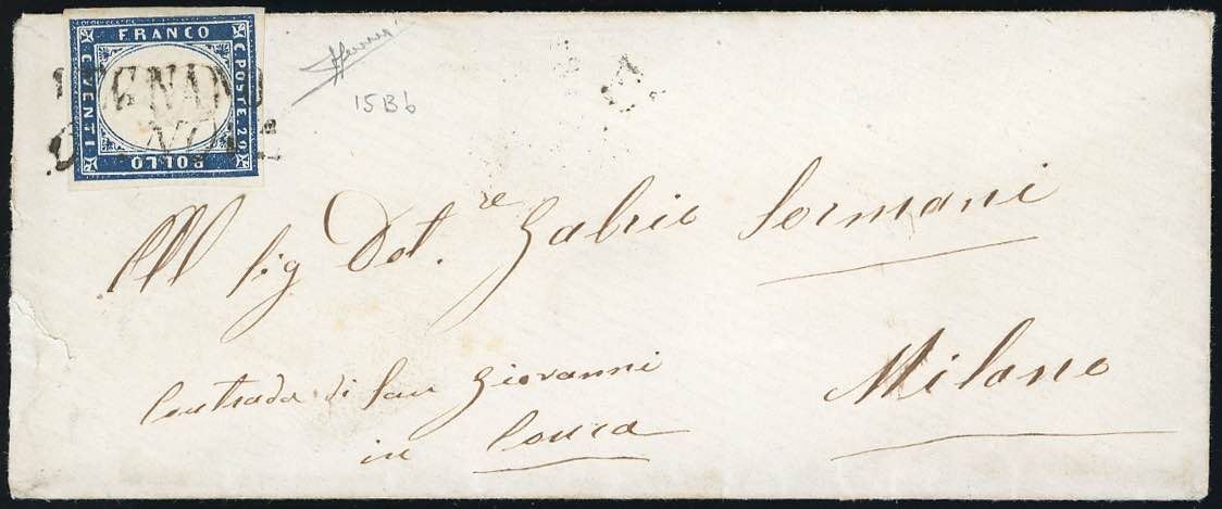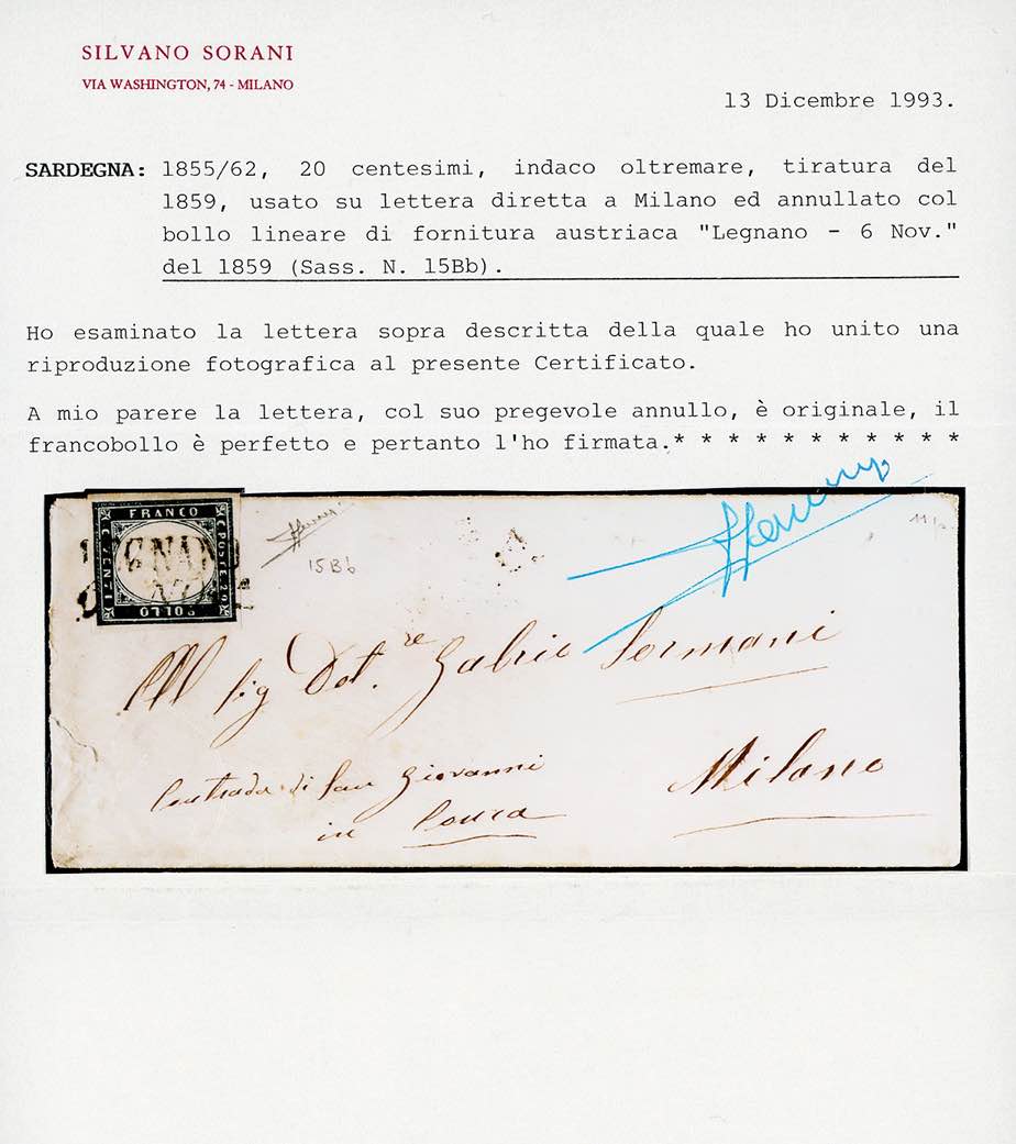 LEGNANO, SD punti 11 - 20 cent. (Sardegna 15Bb), perfetto, su busta del 6/11/1859 a Milano. Cert. Sorani.