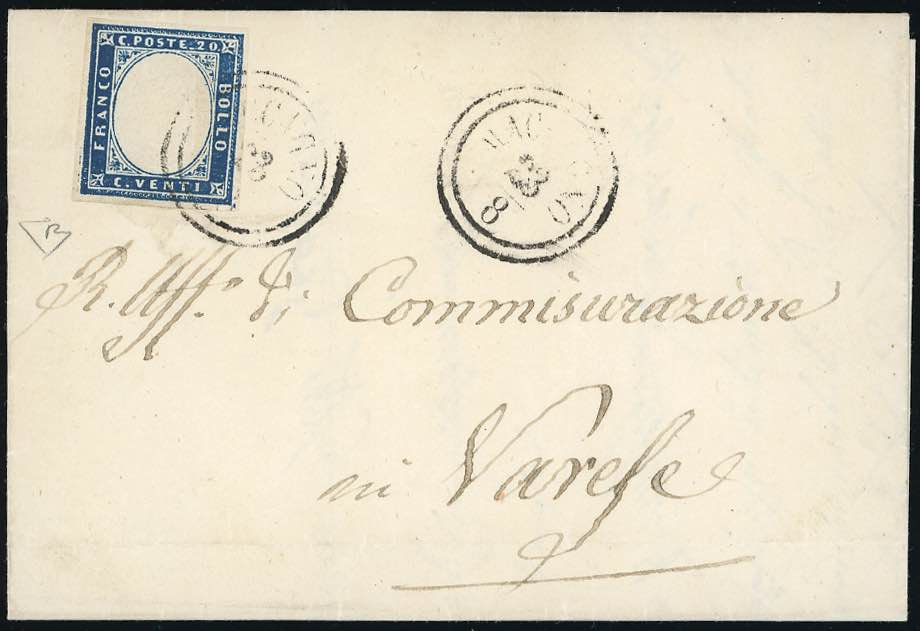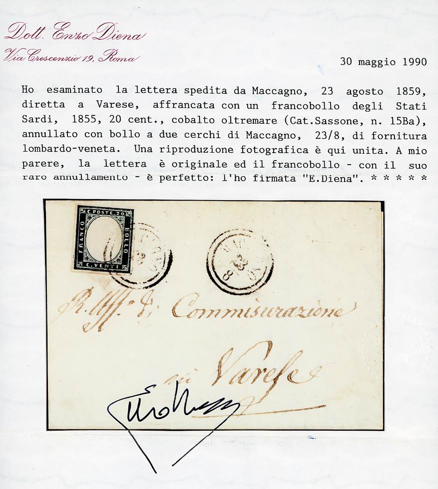 MACCAGNO, C2 punti 11 - 20 cent. (Sardegna 15Ba), perfetto, su sovracoperta di lettera del 23/8/1859 a Varese. Cert. E.Diena.