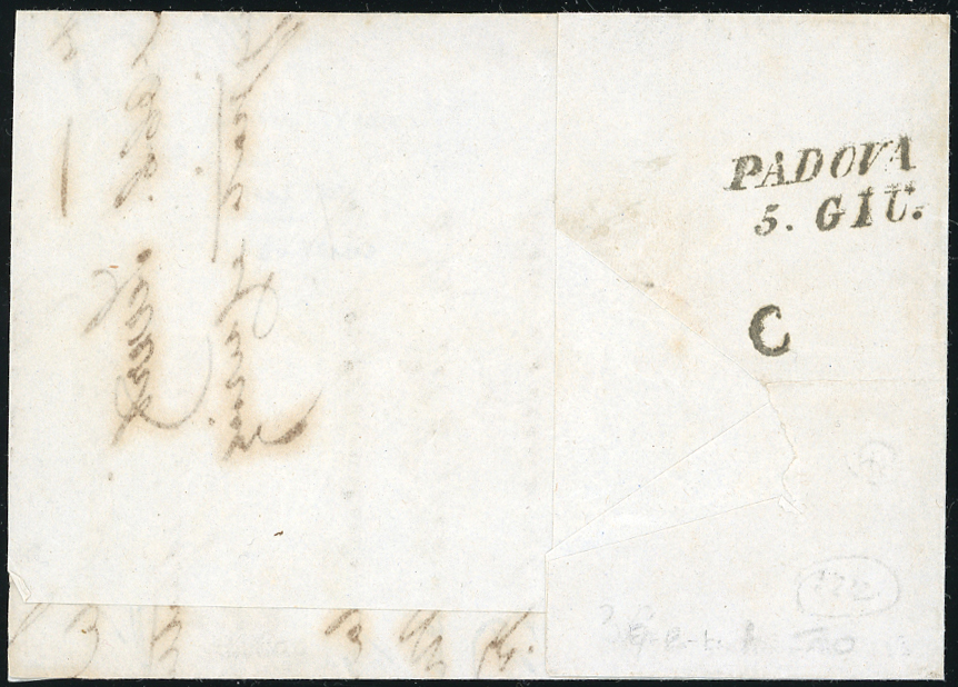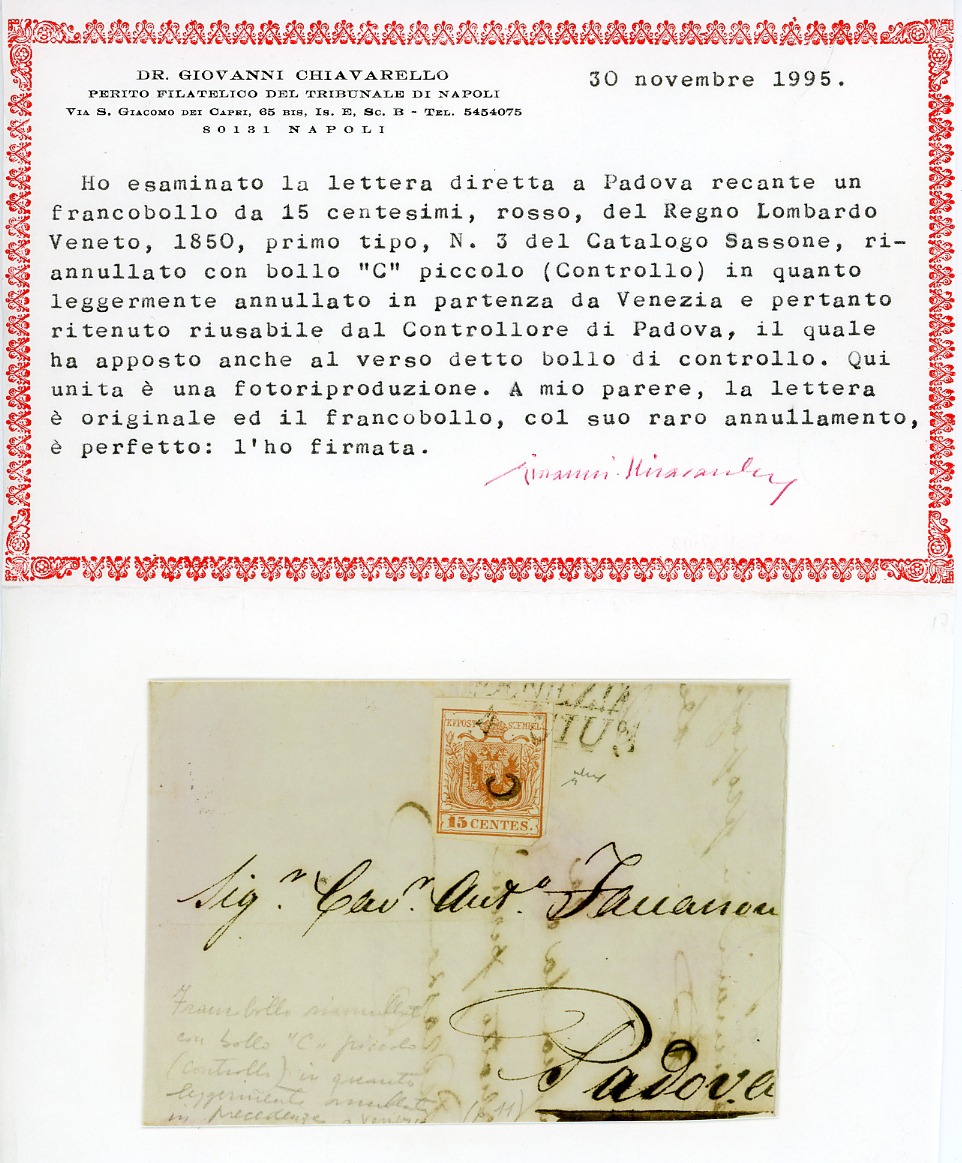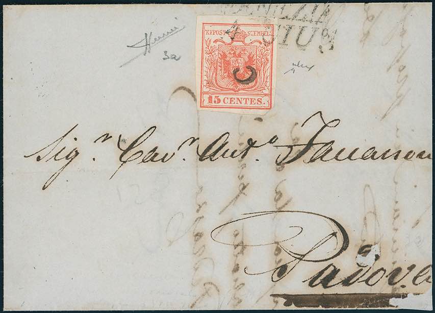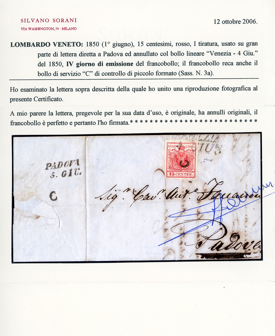 PADOVA, "c" piccolo punti R1 - 15 cent. rosso, I tiratura (3a), perfetto, su lettera, senza il lembo destro, da Venezia 4/6/1850, quarto giorno di emissione, a Padova. Il francobollo venne annullato solo leggermente in partenza, poi riannullato in arrivo dal controllore. Rara! Cert. Sorani e Chiavarello.