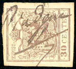PIADENA, a penna non catalogato - 30 cent. (21), perfetto, usato l'11/7. Rarissimo annullo grafico, ad oggi inedito ed unico noto. Cert. ... Leggi tutto