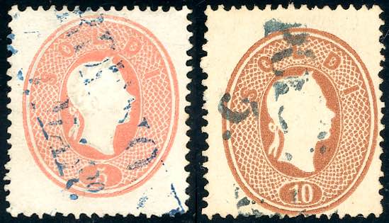 PORDENONE, azzurro/azzurro nerastro punti 9 e 5 - 5 soldi e 10 soldi (33,34), perfetti, il primo con annullo azzurro, il secondo con annullo azzurro nerastro, perfetti. Cert. Ferchenbauer per il secondo.