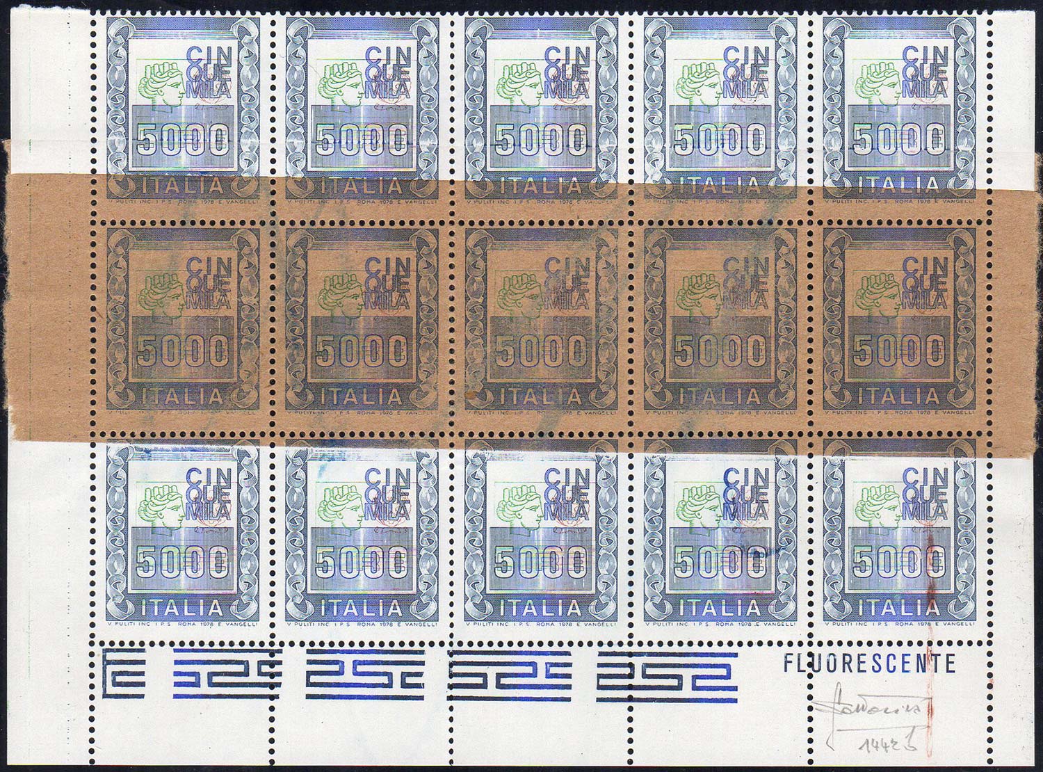 1978 - 5.000 lire Alti Valori, blocco di 15 esemplari stampati su carta ricongiunta (1442b), nuovo, gomma integra, perfetto. Insieme splendido e raro! Ferrario.