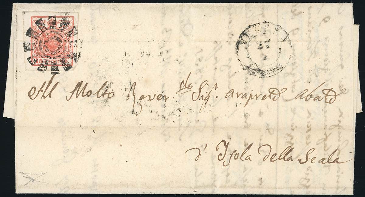 VERONA, M + 2 CO punti 11 - 15 cent. (3), perfetto e ben marginato, su lettera del 27/4/1857 a Isola della Scala. Cert. Bottacchi, in cui è specificato che la piega della lettera è preesistente all'applicazione del francobollo, che è perfetto.
