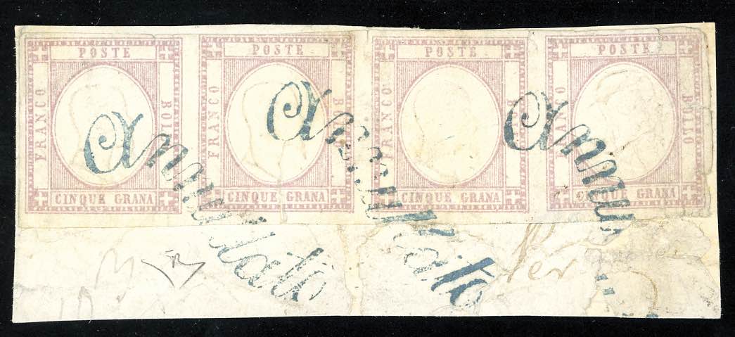 1861 - 5 grana lilla (21c), striscia di quattro, difetti, usata su frammento con lo svolazzo azzurro tipo 17 di Dentecane, punti R2. Insieme unico, di grande rarità. Cert. E.Diena.