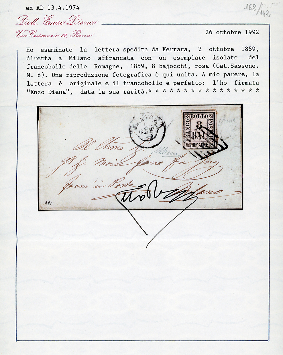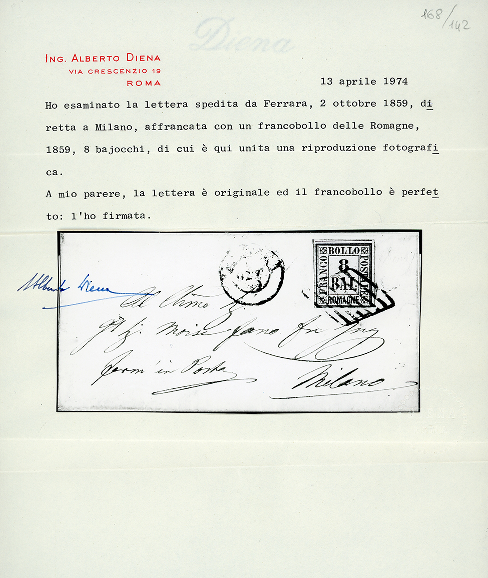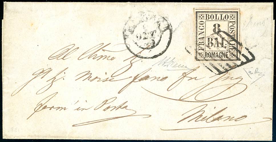 1859 - 8 baj rosa (8), perfetto, su sovracoperta di lettera da Ferrara 2/10/1859 a Milano, bollo d'arrivo. Rara. Em.Diena, cert. A. ed E.Diena.