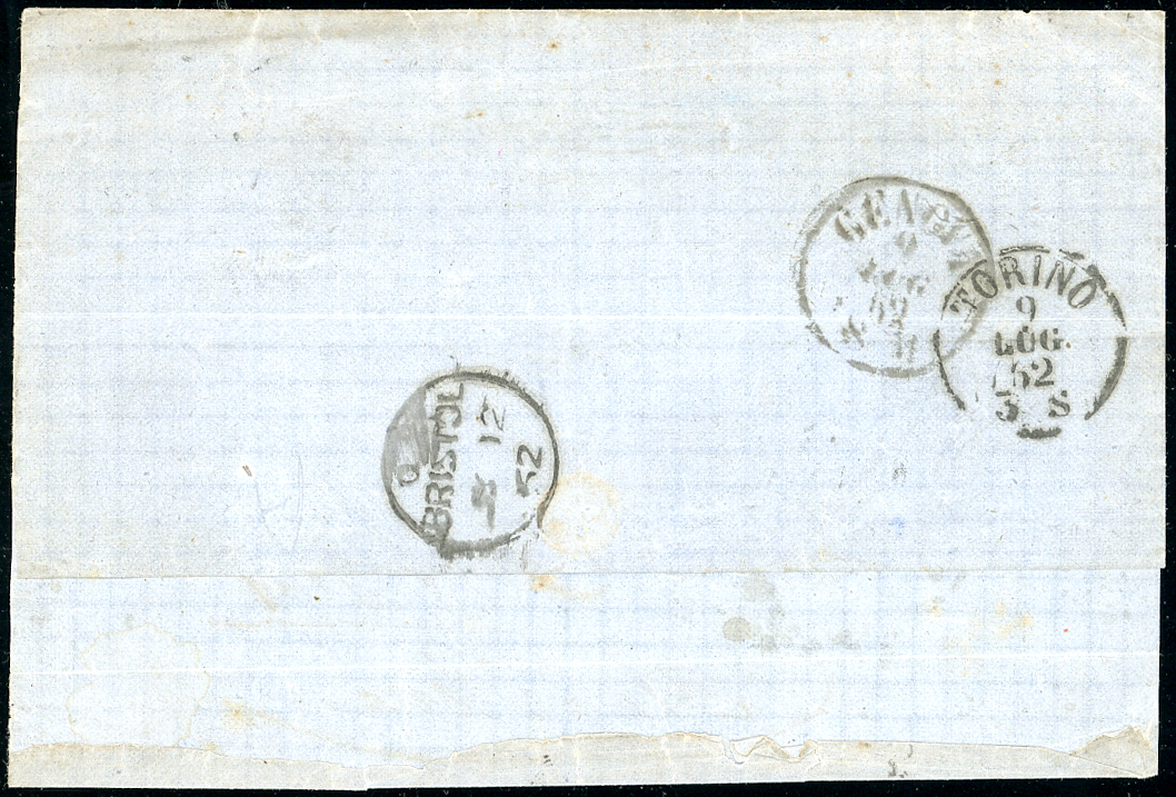 1862 - 20 cent. azzurro oltremare, 40 cent. rosa carminio (15Dc,16E), due margini a filo, su sovracoperta di lettera da Messina 4/7/1862 per l'Inghilterra, bolli di transito e arrivo. Chiavarello. Ex coll. Imperato.