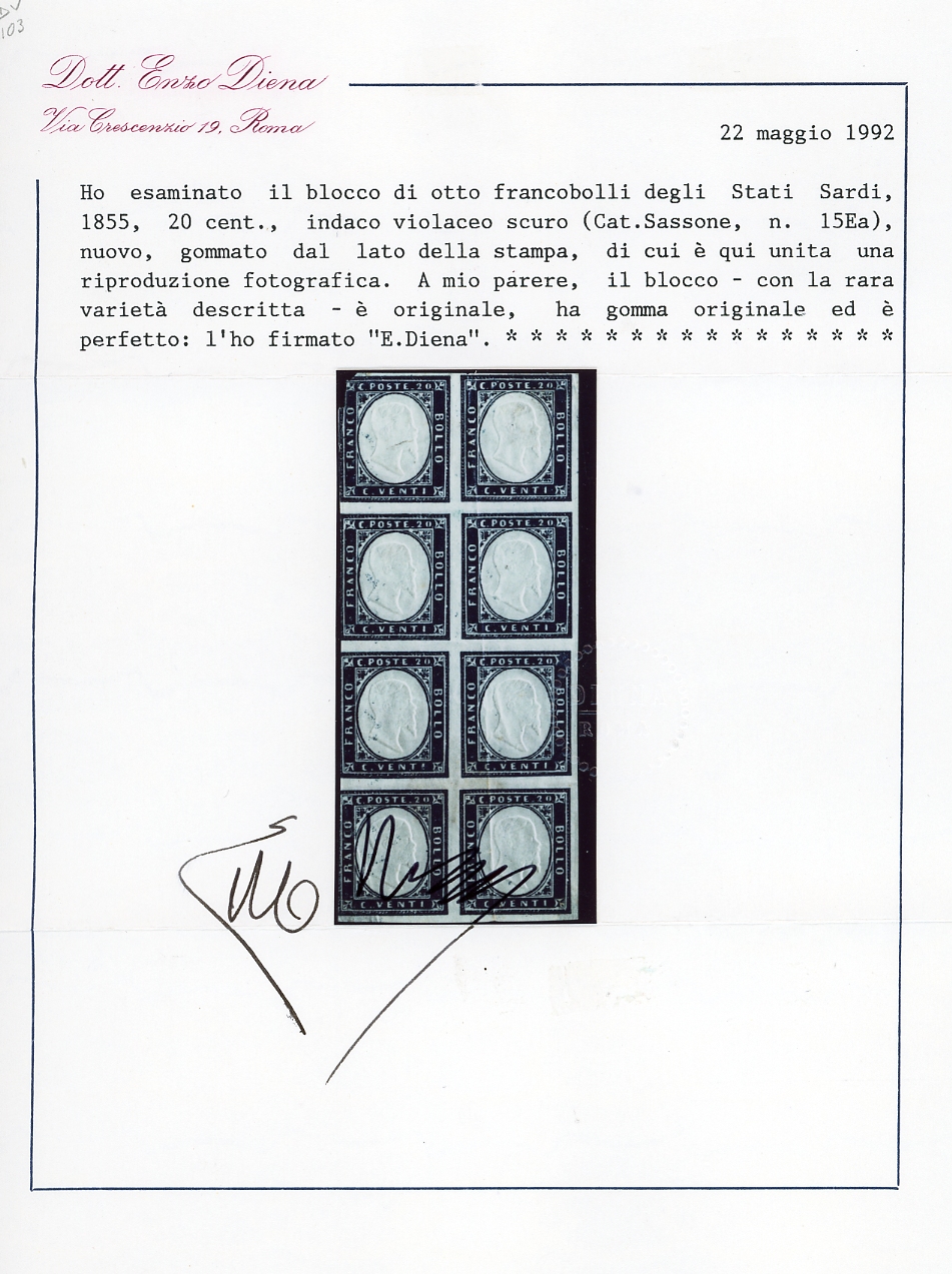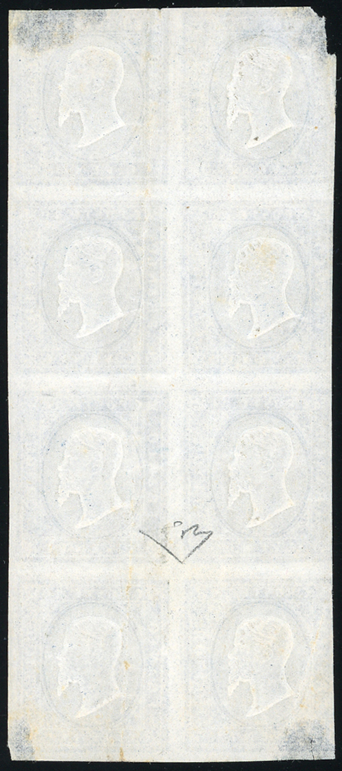 1862 - 20 cent. indaco violaceo scuro, gommato al recto (15Ea), blocco di otto esemplari, lievi difetti. Si tratta del massimo blocco noto di questa rarissima varietà. Inedito! Cert. E.Diena 1992.