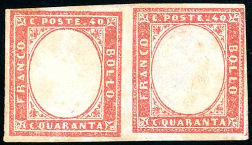 1862 - 40 cent. rosa carminio, coppia orizzontale, un esemplare senza effigie (16E), gomma originale, ossidazioni. Molto rara e ben marginata. A.Diena, Ferrario.