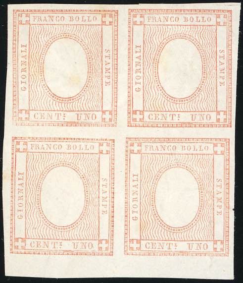 1861 - 1 cent. per stampati (19), prova di stampa in rosso vermiglio chiaro, senza la cifra, blocco di quattro, bordo di foglio, nuovo senza gomma, ottimo stato. Rarissima in blocco! Ferrario.