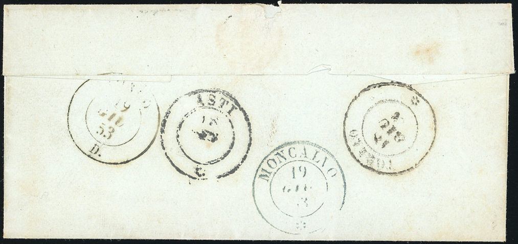CASTELNUOVO D'ASTI, punti R3 - 20 cent. (2f), perfetto, su sovracoperta di lettera del 17/6/1853 per Torino. Rarità del settore, unica nota con la prima emissione! R.Diena, cert. Bottacchi.