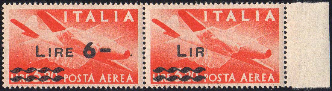 1947 - 6 lire su 3,20 lire Democratica, varietà "liri", "e" deformata e senza la cifra "6", in coppia con il normale (135da), bordo di foglio, gomma integra, perfetta. Rara!