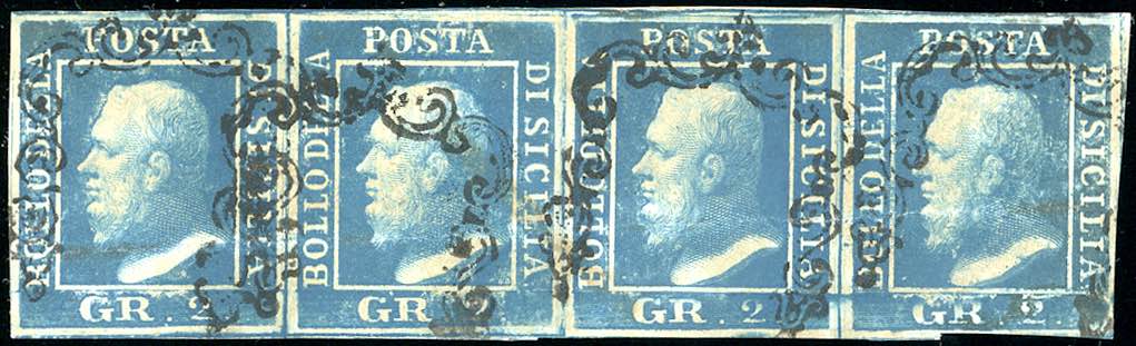 1859 - 2 grana cobalto, II tavola (7b), striscia orizzontale di quattro pos. 87/90, usata, lieve piega orizzontale, ottimo aspetto. Rara. Cert. Raybaudi (cat. Sassone € 11.000 in proporzione).