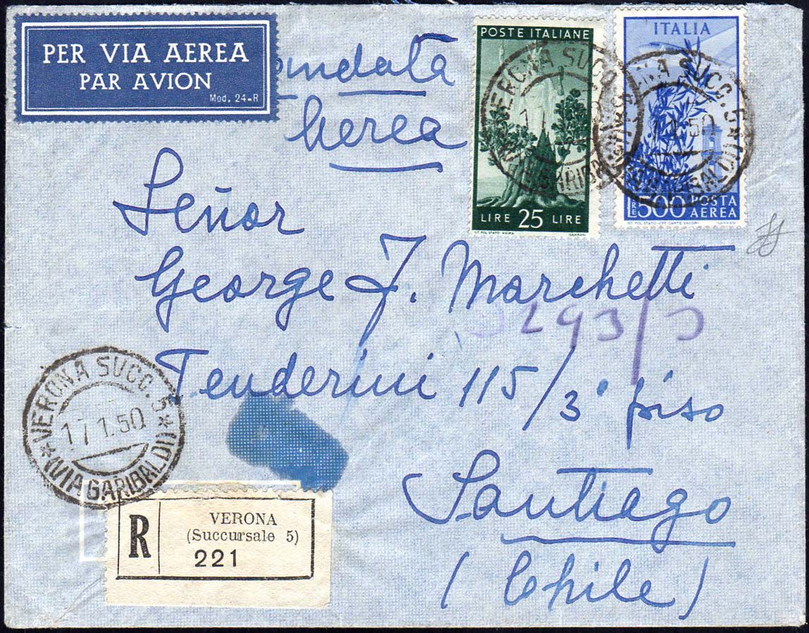 1950 - 500 lire Campidoglio e 25 lire Democratica (144,562), perfetti, su aerogramma raccomandato da Verona 17/1/1950 per il Cile. Ferrario.