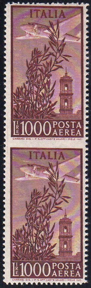 1952 - 1.000 lire Campidoglio, filigrana ruota, dent. 14 1/4 x 13 1/4, coppia verticale non dentellata al centro (145Ac), gomma integra, perfetta. Rara.