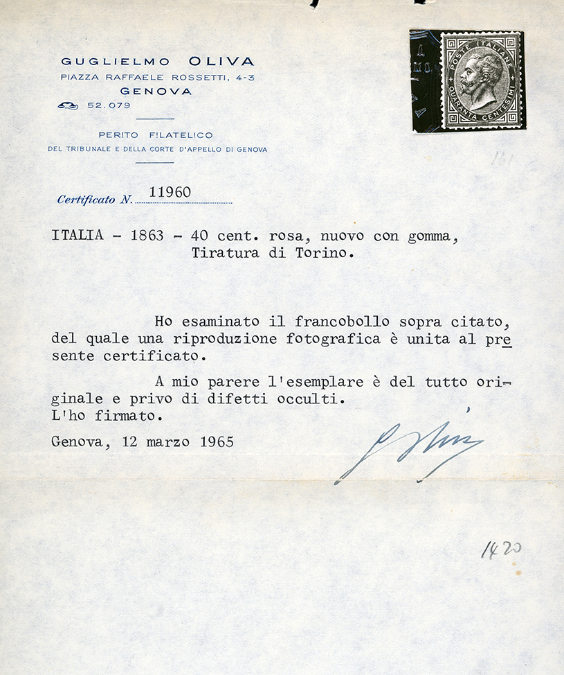 Lotto 974 - 1863 - 40 cent. De La Rue, tiratura di Torino (T20), nuovo, ...