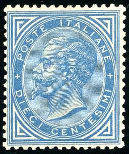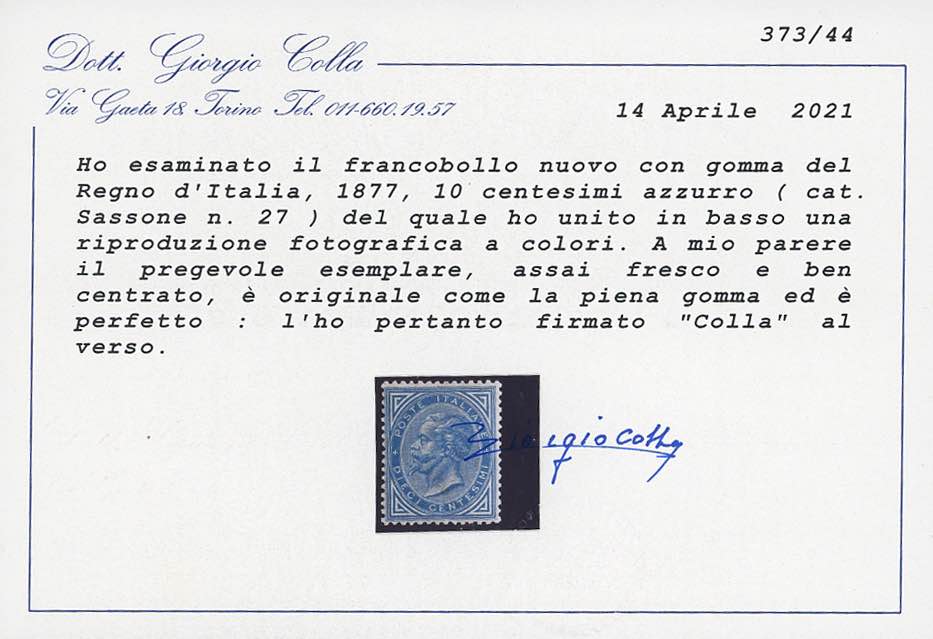 1877 - 10 cent. azzurro (27), ben centrato, gomma originale, invisibile traccia di linguella, perfetto. Bello e molto fresco. Raybaudi, cert. Colla (cat.Sassone 12.000/17.500 €).