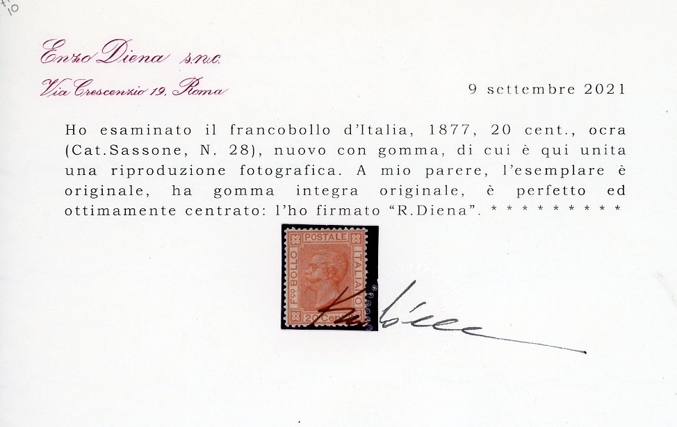 1877 - 20 cent. ocra arancio (28), nuovo, gomma originale integra, perfetto. Freschissimo e ben centrato. Cert. Diena e Ferrario.
