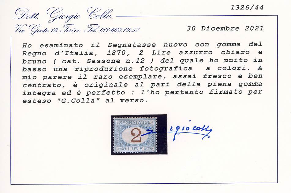 1870 - 2 lire azzurro chiaro e bruno (12), buona centratura, gomma originale integra, perfetto. Bello e non comune di questa qualità. Cert. Colla.