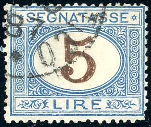 1874 - 5 lire azzurro e bruno, doppia stampa della cifra (13c), usato, perfetto. A.Diena, cert. E.Diena.
