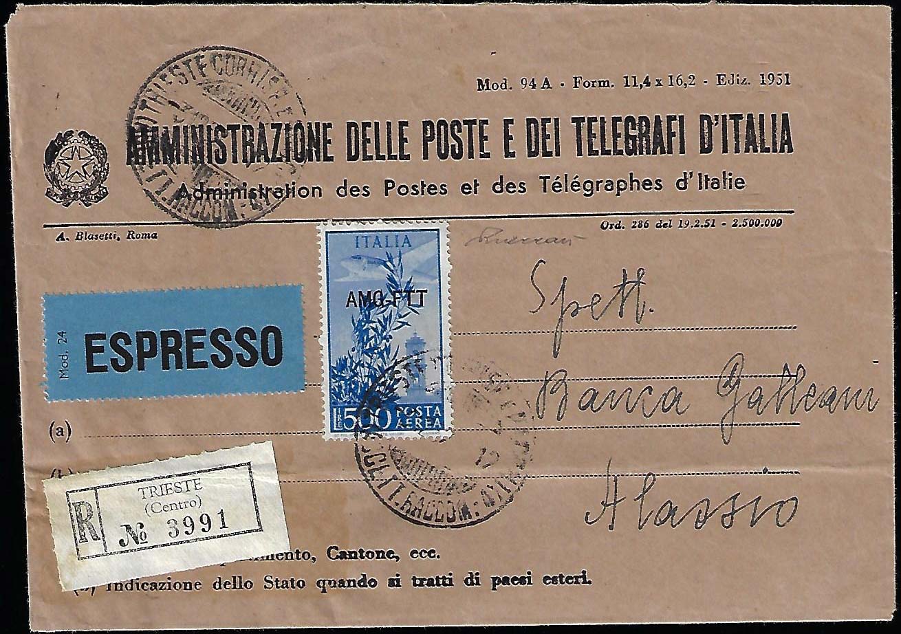 POSTA AEREA 1952 - 500 lire Campidoglio (A25), perfetto, isolato su raccomandata espresso da Trieste 3/12/1952 ad Alassio. Non comune! ... Leggi tutto