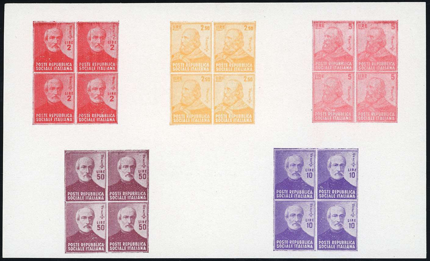 1944 - Mazzini e Garibaldi, prove (Unificato S511A/E), blocchi di quattro in foglietto, senza gomma come sempre, perfetti.