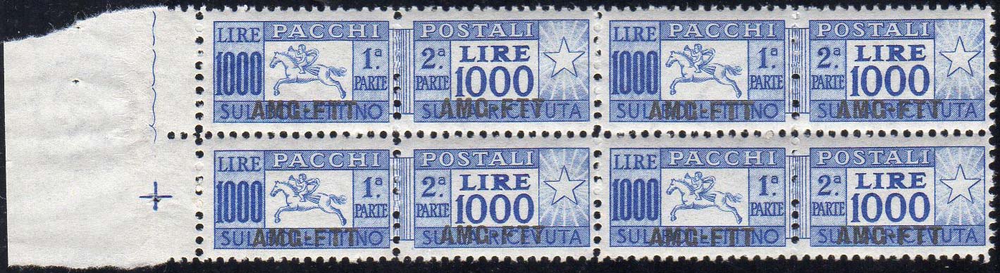 PACCHI POSTALI 1954 - 1.000 lire Cavallino soprastampato (26), ottima centratura, blocco di quattro, gomma integra, perfetto. Bello! ... Leggi tutto