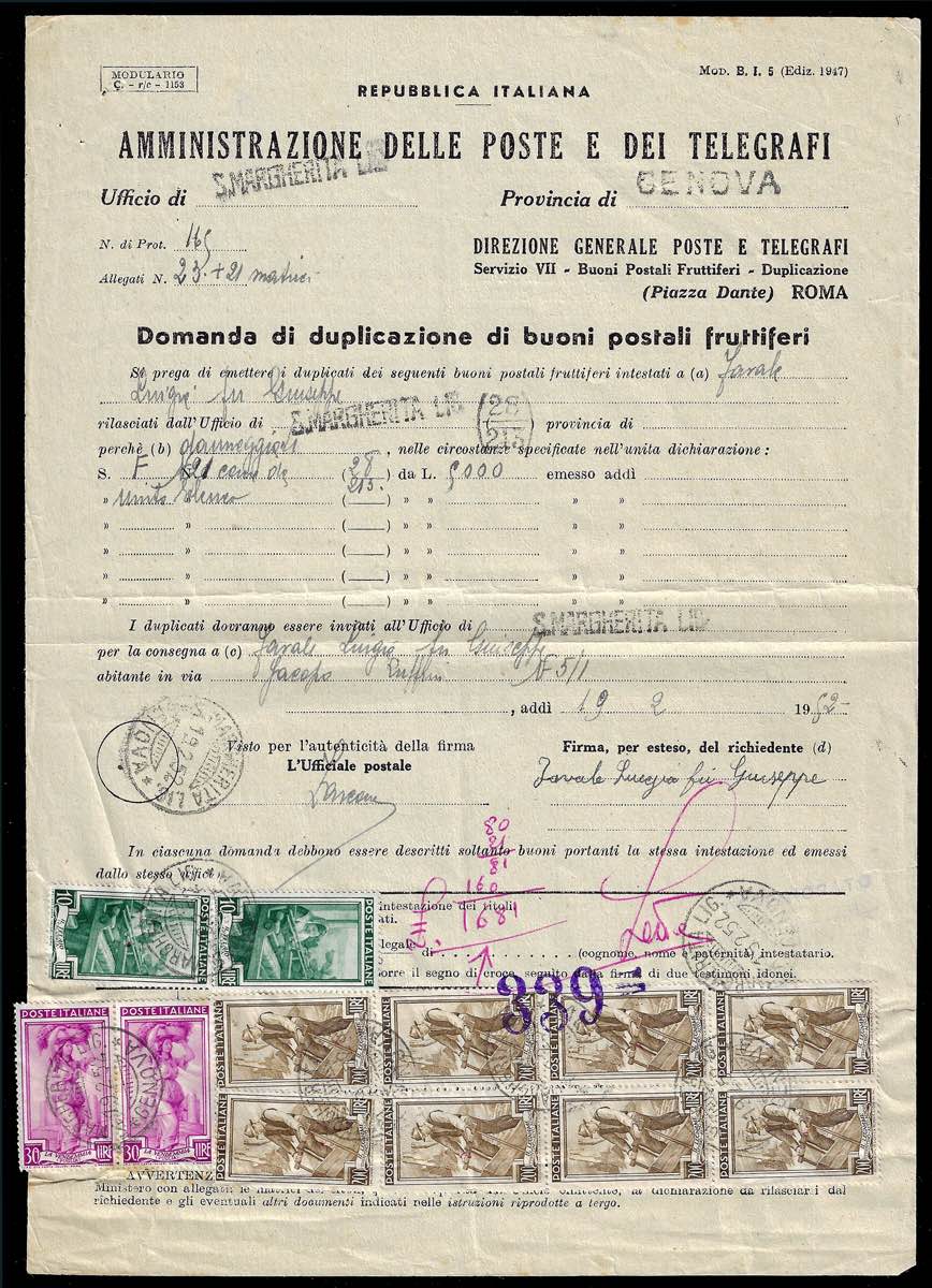 1952 - 200 lire, blocco di sei e coppia, 10 lire, due esemplari, 30 lire, due esemplari Lavoro, filigrana ruota (652,639,644), ottimo stato, su modulo completo di duplicazione di buoni postali fruttiferi, annullati a S.Margherita 19/2/1952. Non comune.
