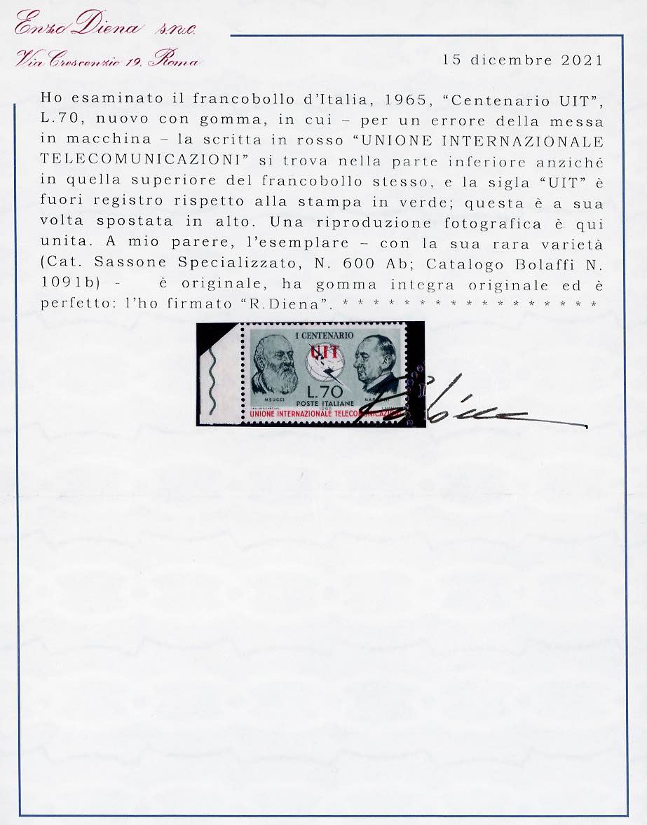 1965 - 70 lire "UIT in basso", francobollo naturale (Bol.1091B € 39.000, Sass.996a), bordo di foglio, gomma originale integra, perfetto. Splendido e raro! Tiratura 80 esemplari. Cert. Diena.