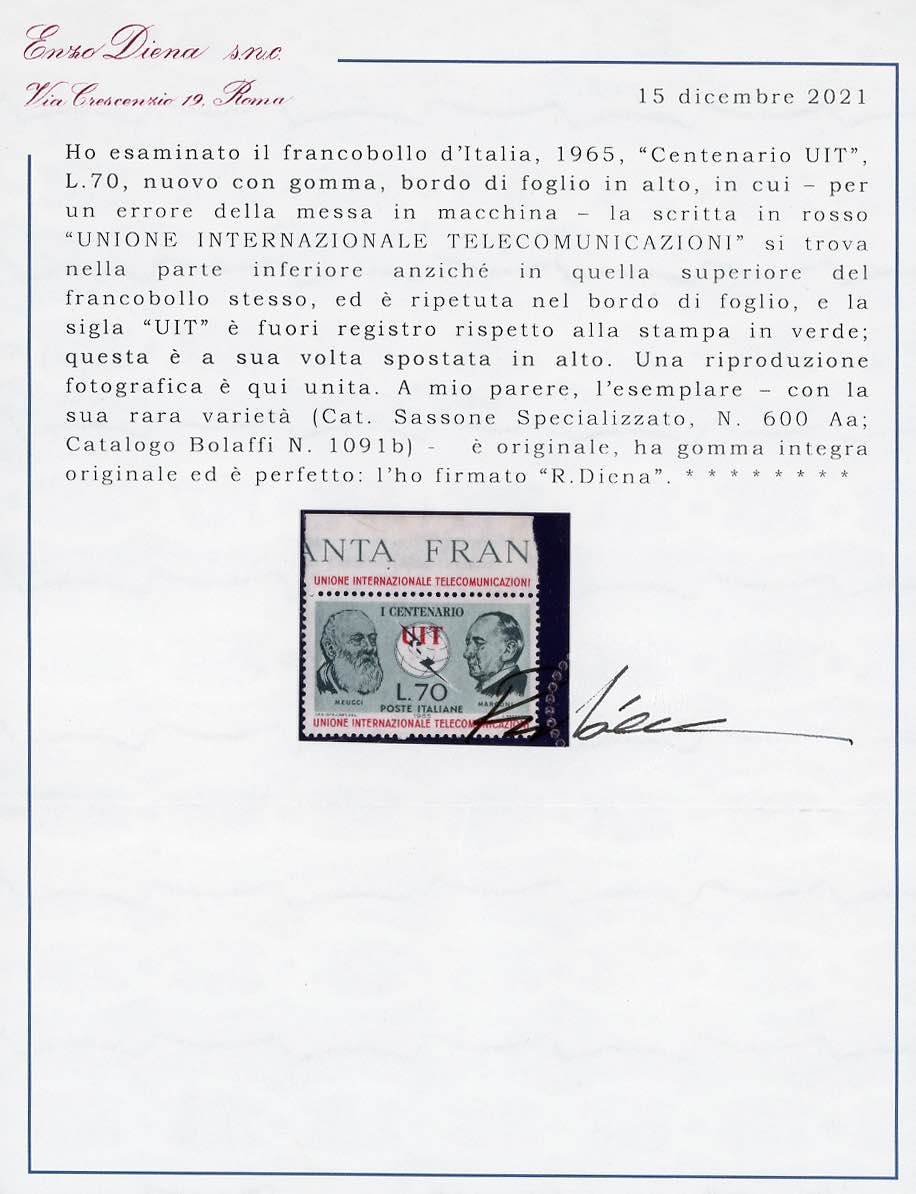 1965 - 70 lire "UIT in basso", francobollo naturale, bordo di foglio in alto su cui è ripetuta la scritta in rosso (Bol.1091B € 39.000++, Sass.996c), gomma originale integra, perfetto. Splendido e raro, 10 esemplari noti. Cert. Diena.