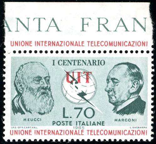1965 - 70 lire "UIT in basso", francobollo naturale, bordo di foglio in alto su cui è ripetuta la scritta in rosso (Bol.1091B € ... Leggi tutto
