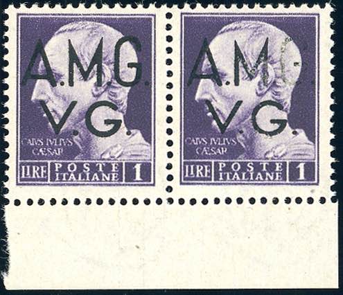 1945 - 1 lira Imperiale (8), coppia orizzontale, il secondo esemplare con al "G" di "A.M.G." evanescente, bordo di foglio, gomma integra, ... Leggi tutto