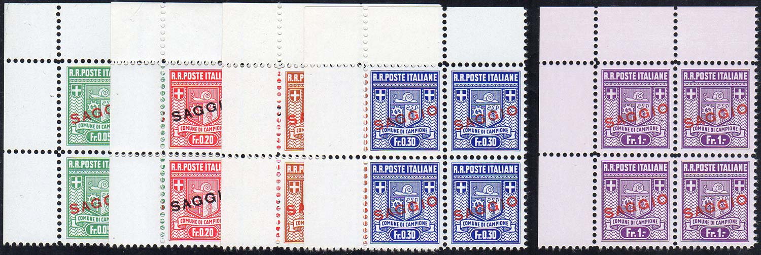 CAMPIONE D'ITALIA 1944 - Stemma, I tiratura, soprastampati "saggio" (1a/5a, nota) blocchi di quattro angolo di foglio, gomma originale integra, perfetti. Cert. Ferrario.