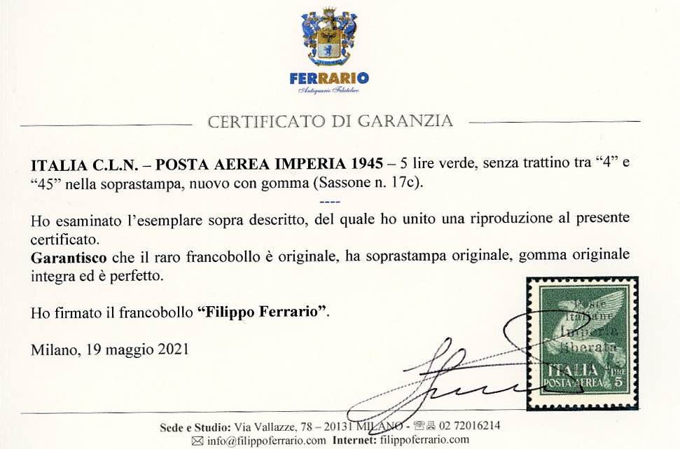 IMPERIA 1945 - 5 lire posta aerea, senza trattino tra "4" e "45" (17c), gomma integra, perfetto. Cert. Ferrario.
