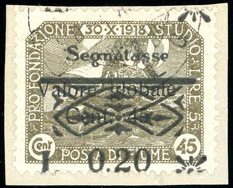 FIUME SEGNATASSE 1921 - 0,20 lire su 45 cent, soprastampa spostata in basso, "a cavallo" (30 p.c.), perfetto, usato su frammento. Mondolfo, ... Leggi tutto
