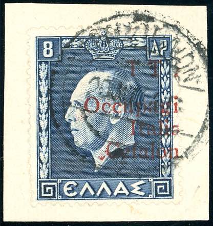 EMISSIONI DI ARGOSTOLI 1941 - 8 d., soprastampa rossa metà sinistra (2), perfetto, usato su frammento. Raro. Penco, cert. Ferrario.
