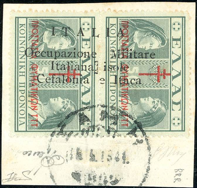 EMISSIONI DI ARGOSTOLI 1941 - 50 l. + 50 l. Beneficenza, soprastampa verticale dal basso in alto (35d), perfetto, usato su frammento. ... Leggi tutto