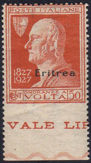 1927 - 50 cent. Volta, non dentellato in basso (121ha), nuovo, gomma originale integra, perfetto. Raro! Ferrario.