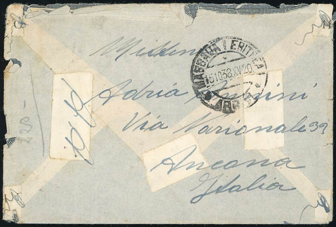 SEGNATASSE 1938 - 1 lira arancio, coppia perfetta con soprastampa fortemente spostata a sinistra (34), varietà finora INEDITA, su lettera in fermo posta da Ancona 10/10/1938 a Massaua, affrancata con francobolli di Regno. Unica! Cert. Ferrario.