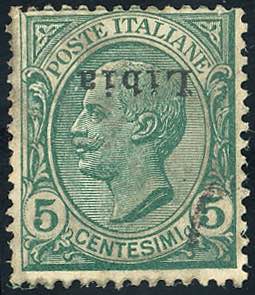 1912 - 5 cent. Leoni, soprastampa capovolta (3c), perfetto, usato. Rarissimo, TRE SOLI ESEMPLARI NOTI. Cert. G.Bolaffi, A.Diena, Ferrario.