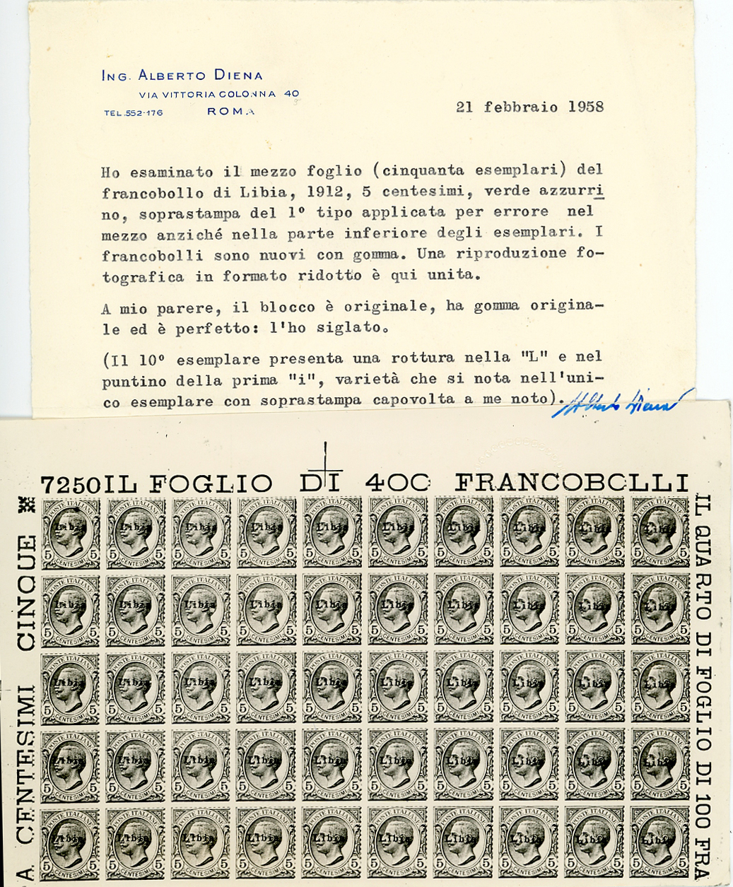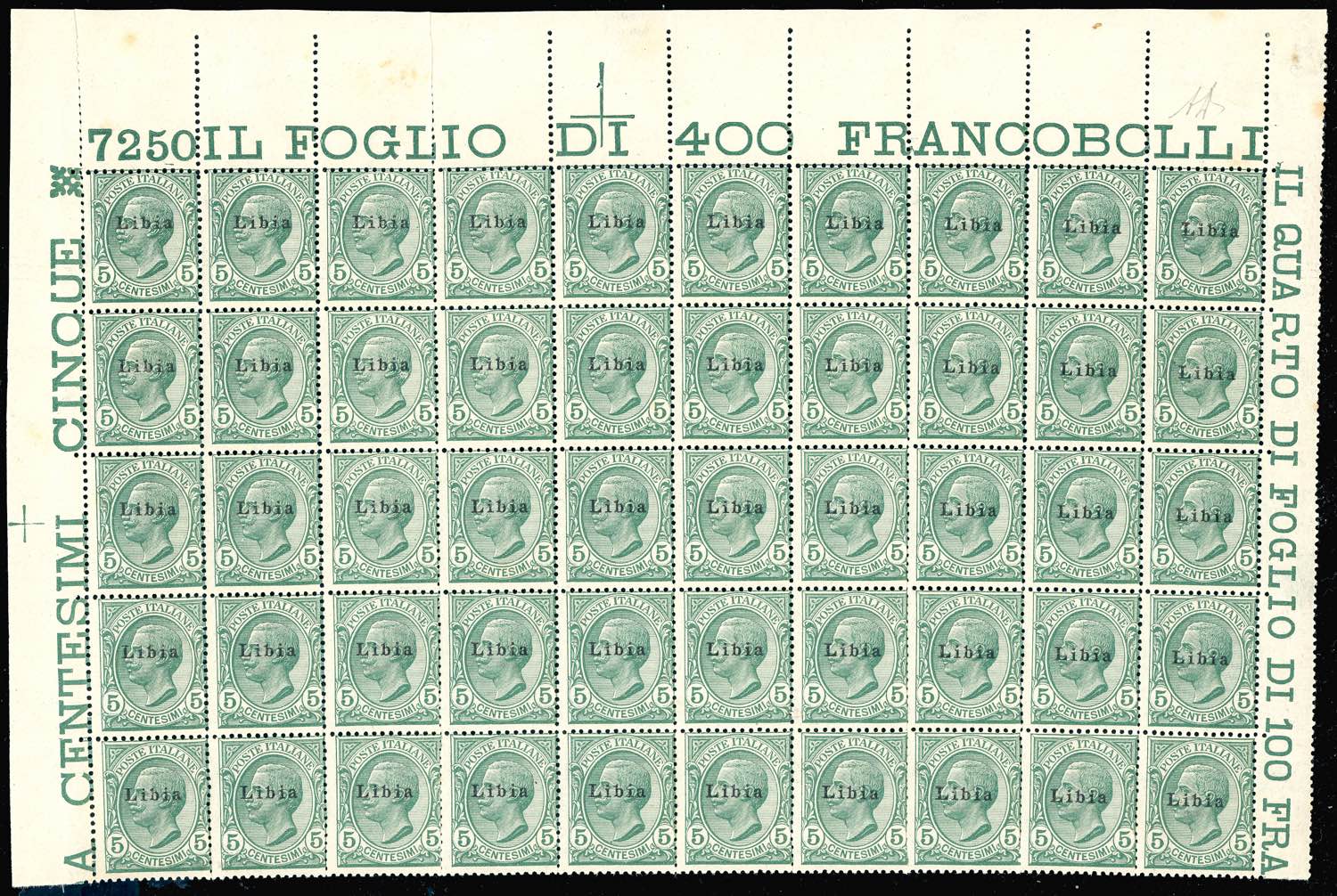 1912 - 5 cent. Leoni, soprastampa fortemente spostata in alto, al centro e obliqua (3k), blocco di cinquanta esemplari, angolo di foglio con numero di tavola, gomma integra, perfetto. Cert. A.Diena.