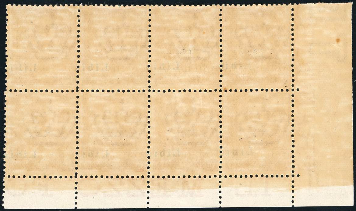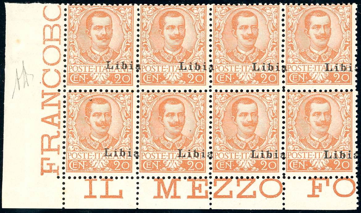 1912 - 20 cent. Floreale soprastampato, blocco di otto, i primi due esemplari con solo "Libi" in soprastampa, gli altri con "a Libi" ... Leggi tutto