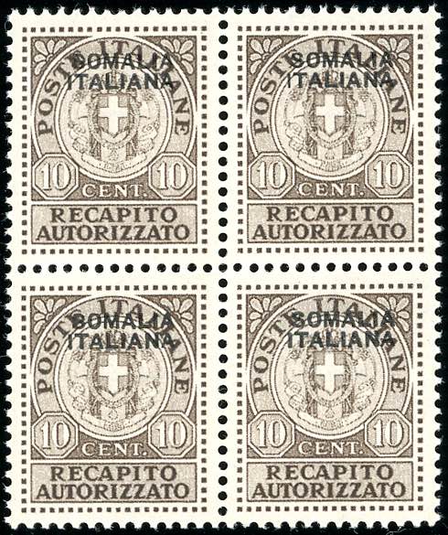RECAPITO AUTORIZZATO 1939 - 10 cent. soprastampato (1), blocco di quattro, gomma integra, perfetto. Bello. A.Diena.