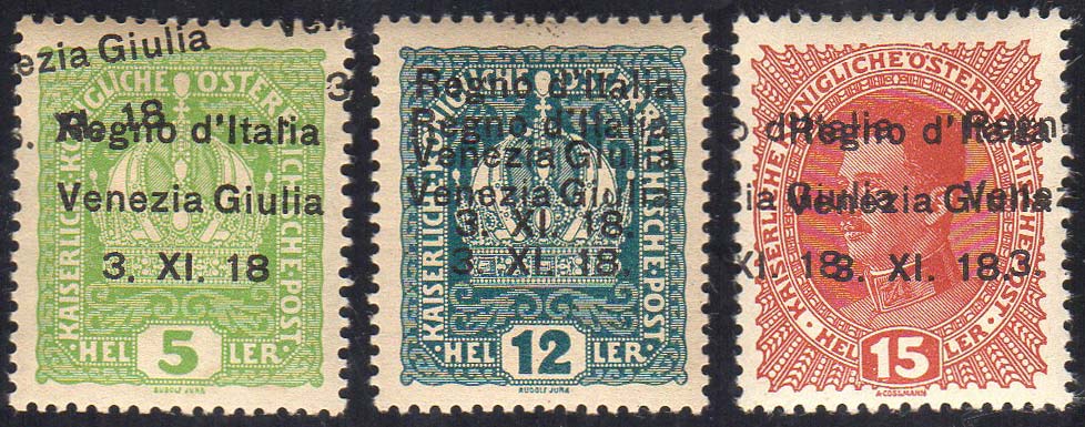 VENEZIA GIULIA 1918 - 5 h., doppia soprastampa di cui una obliqua, 12 e 15 h., doppia soprastampa (2c,5b,6b), gomma integra, perfetti.