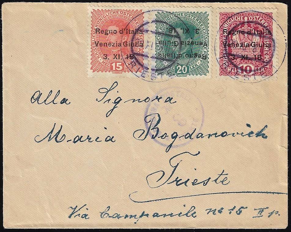 VENEZIA GIULIA 1918 - 20 h., soprastampa capovolta, 10 h. e 15 h., tutti soprastampati (7aa,4,6), perfetti, su busta da Trieste 20/11/1918 ... Leggi tutto