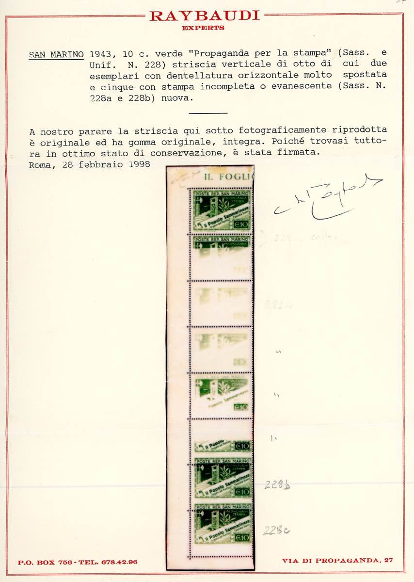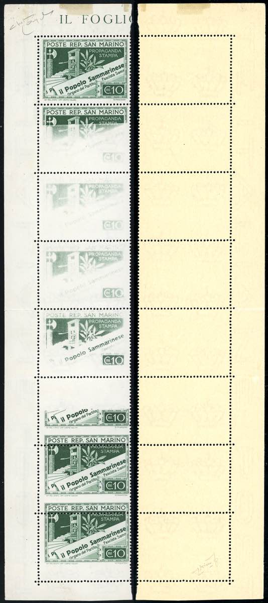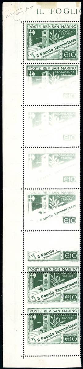 1943 - 10 cent. Propaganda per la stampa, striscia verticale di otto, quattro esemplari con stampa evanescente, tre con dentellatura ... Leggi tutto